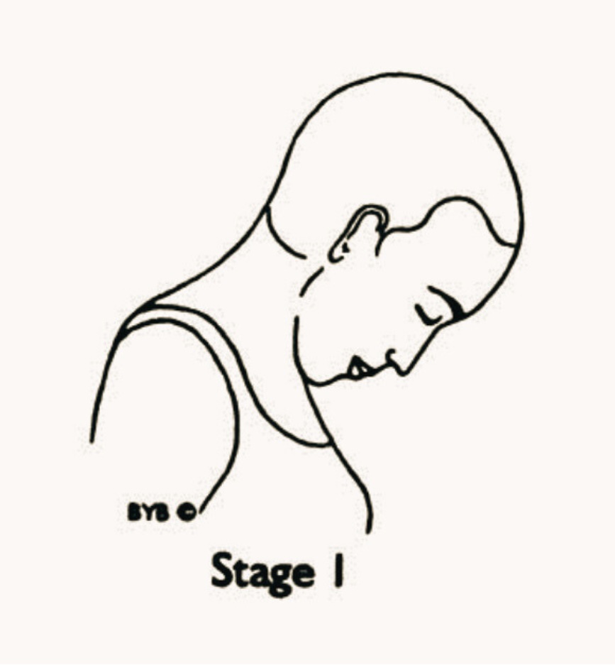 Steps: : Stand with feet at shoulder width distance apart. Place the hands on the hips. Inhale, move the head as far back as comfortable. Exhale, move the head forward and the to touch the chin to the chest.
